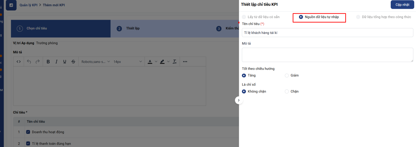 +Tỉ lệ khách hàng tái kí: đây là chỉ tiêu tự nhập, giám đốc kinh doanh có thể tự nhập số liệu trong kì KPI