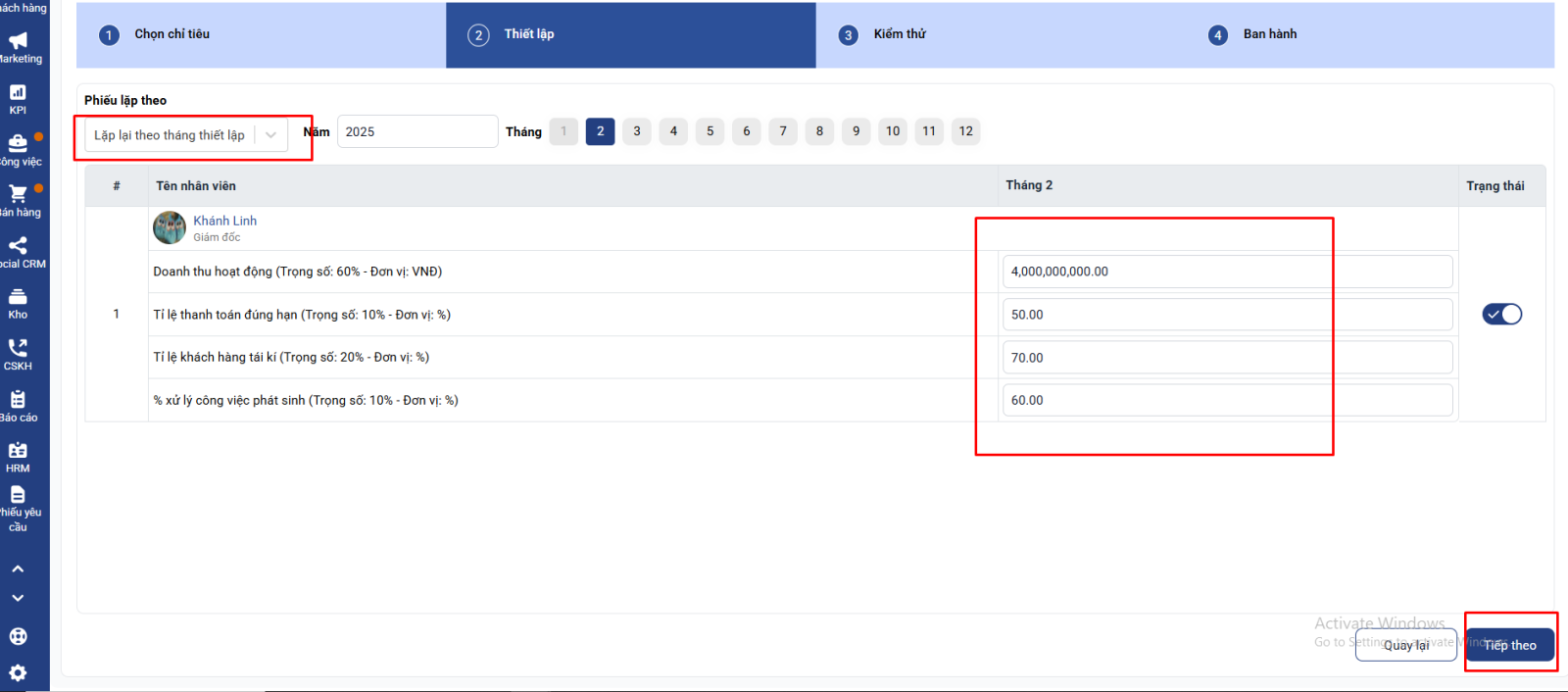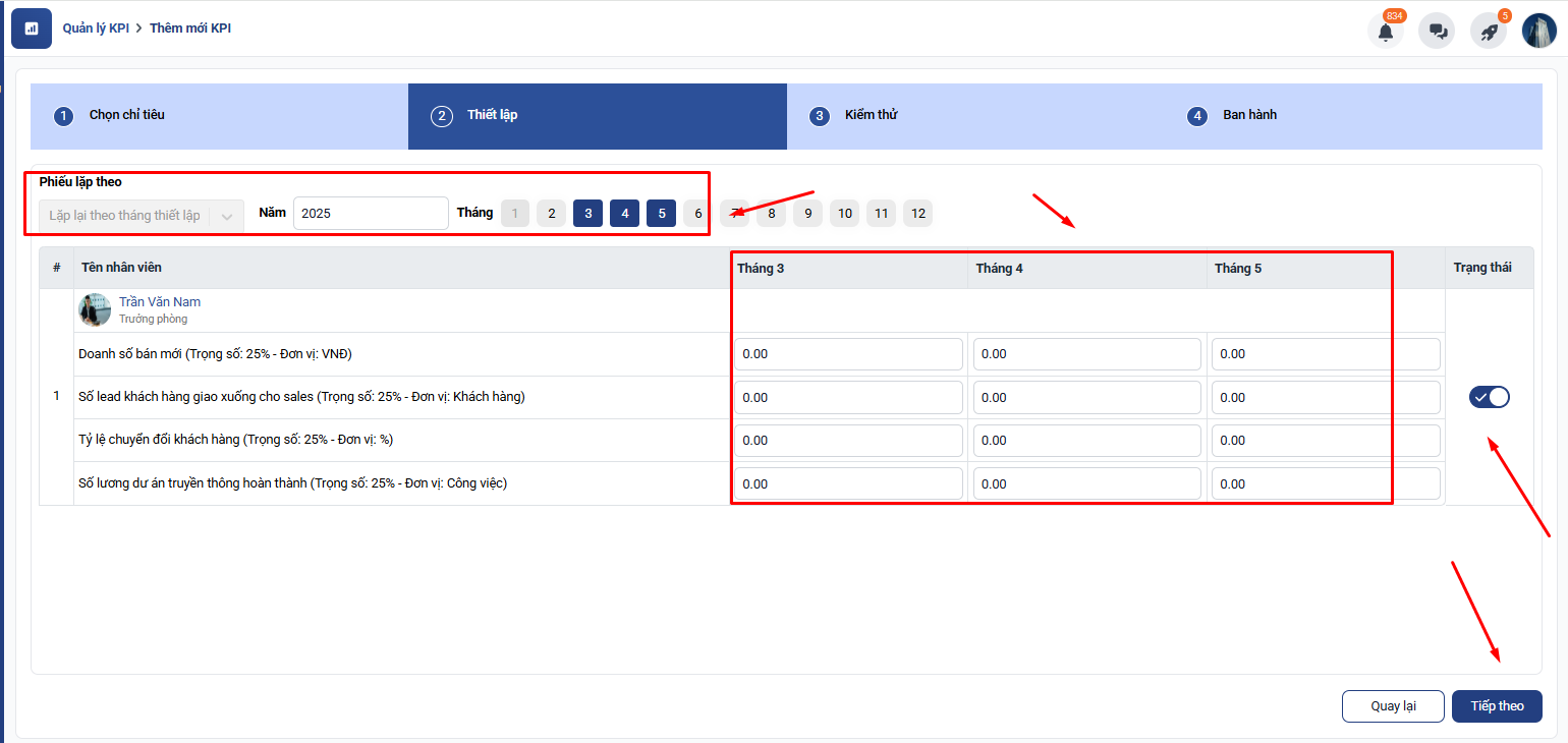 Bước 3: Bạn ấn tiếp theo và chọn chỉ tiêu kpi này theo hướng lặp lại hàng tháng hay lặp lại theo tháng thiết lập và điền trọng số tương ứng với từng tháng chỉ tiêu: