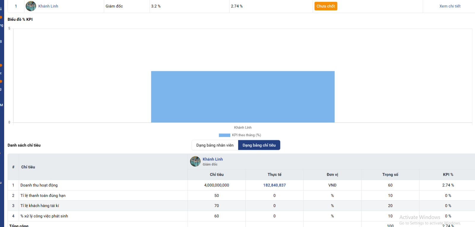 Bước 4: Tại bước này hệ thống đã tính toán số liệu dự trên chỉ tiêu kpi thiết lập để hiển thị % kpi của Giám đốc kinh doanh bất động sản: