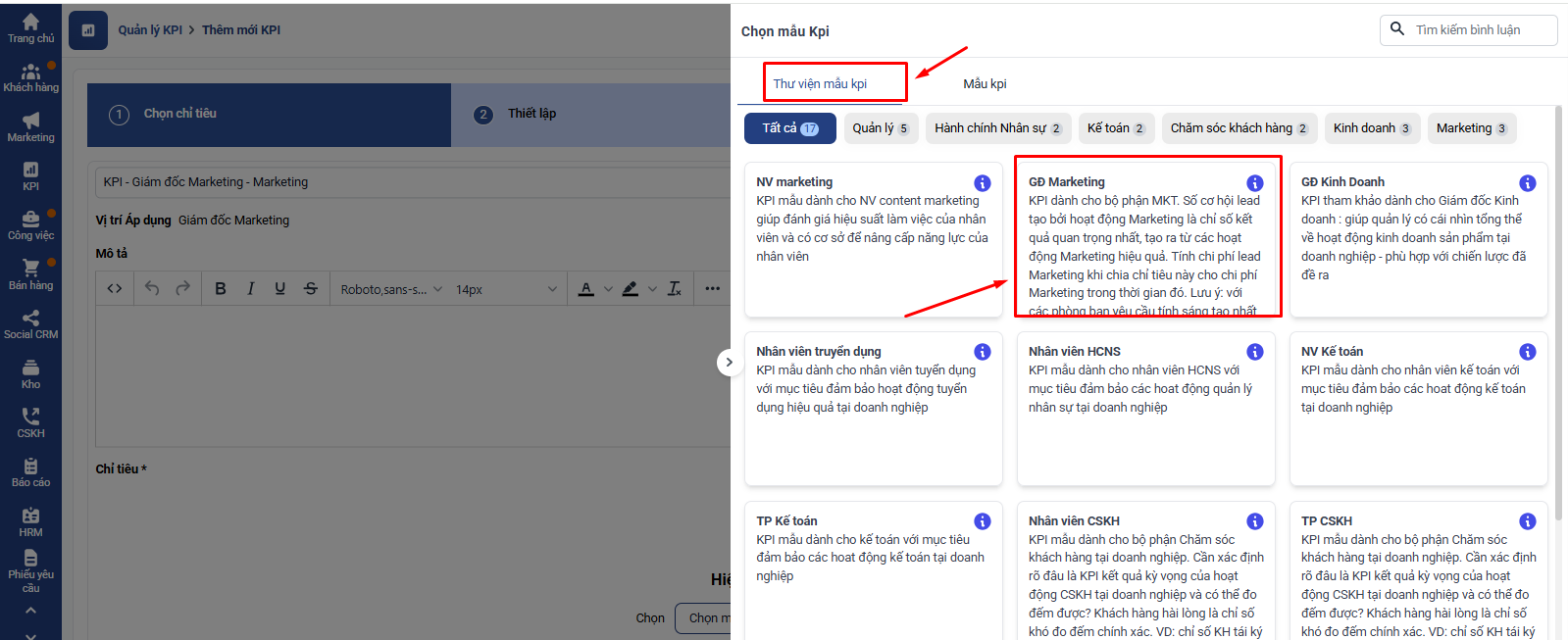 Tại màn hình thêm mới KPI → Chọn Mẫu chỉ tiêu → Thư viện mẫu KPI → GĐ Marketing