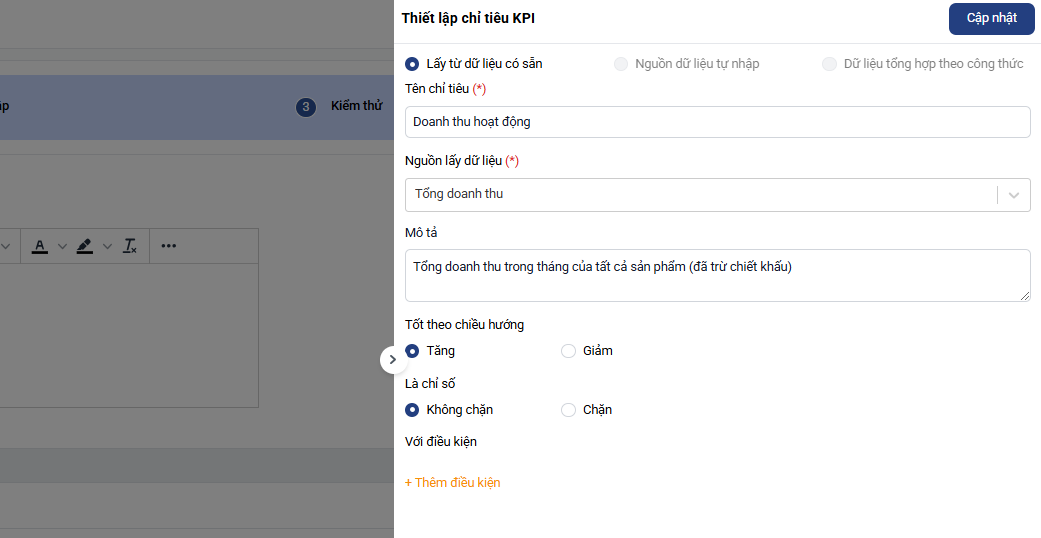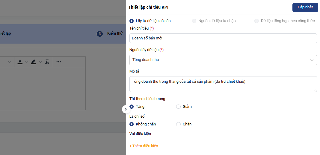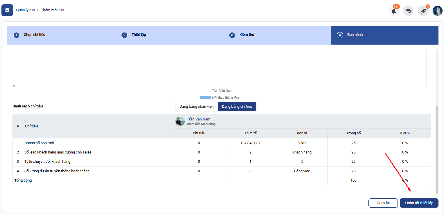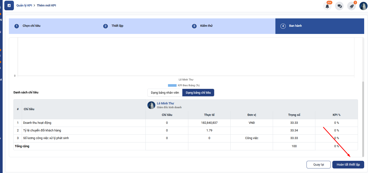 Sau khi nhập đầy đủ thông tin, nhấn Hoàn tất thiết lập để hoàn tất tạo KPI.
