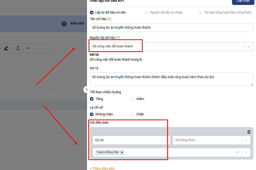 - Số lương dư án truyền thông hoàn thành: Lấy tự động theo số công việc đã hoàn thành (có thể thêm điều kiện ràng buộc kèm theo dự án)