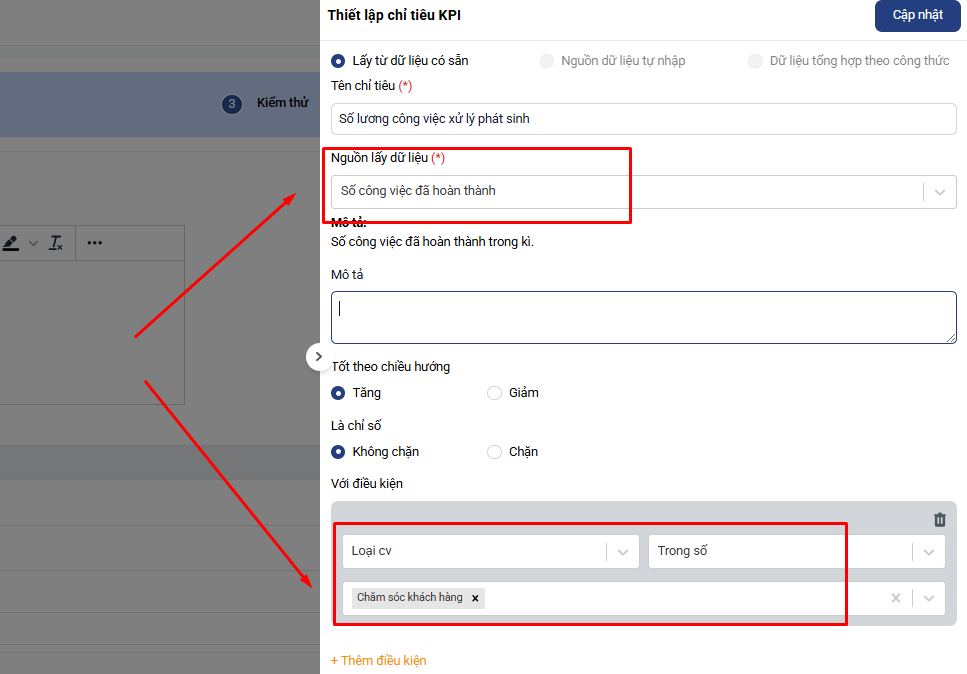 - Số lượng công việc xử lý phát sinh: Lấy tự động theo số công việc đã hoàn thành (thêm điều kiện ràng buộc là công việc phải thuộc loại công việc Chăm sóc khách hàng)