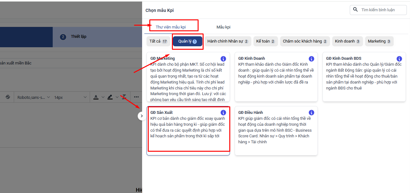 Tại màn hình thêm mới KPI → Chọn Mẫu chỉ tiêu → Thư viện mẫu KPI → Quản lý → GĐ Sản xuất