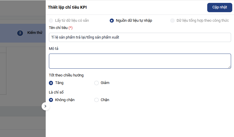 - Tỉ lệ sản phẩm trả lại/tổng sản phẩm xuất: Nguồn dữ liệu tự nhập