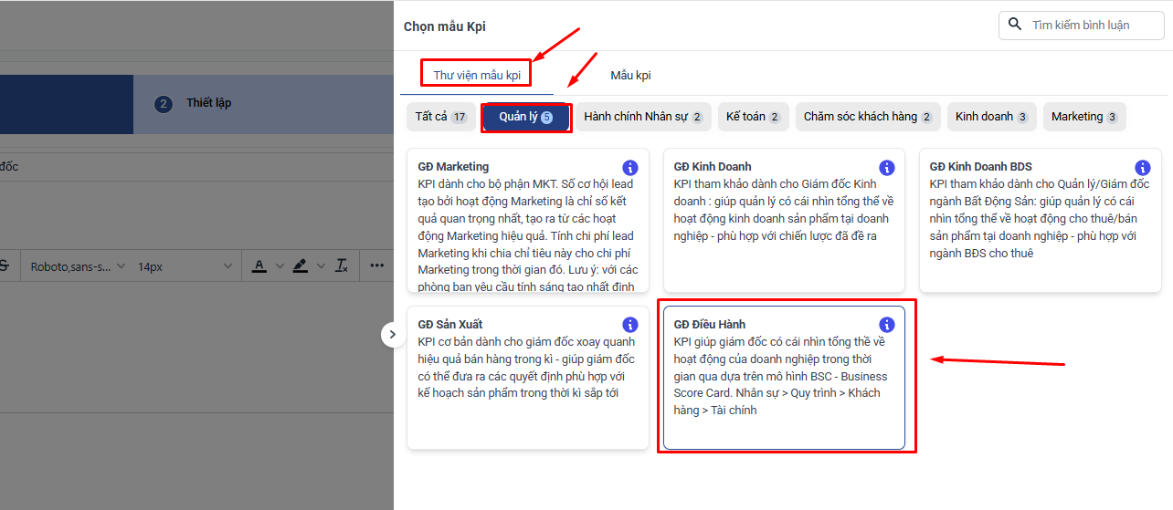 Tại màn hình thêm mới KPI → Chọn Mẫu chỉ tiêu → Thư viện mẫu KPI → Quản lý → GĐ Điều hành